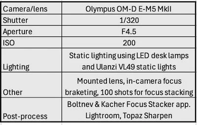 The shot was taken with Olympus OMD MII with a 30mm macro lens at F4.5 and shutter of 1/320 with the camera mounted in a jig. The shots were collected using in-camera focus bracketing with two passes to collect 100 shots. The image was focus stacked using Boltnev & Kacher's Focus Stacker app.