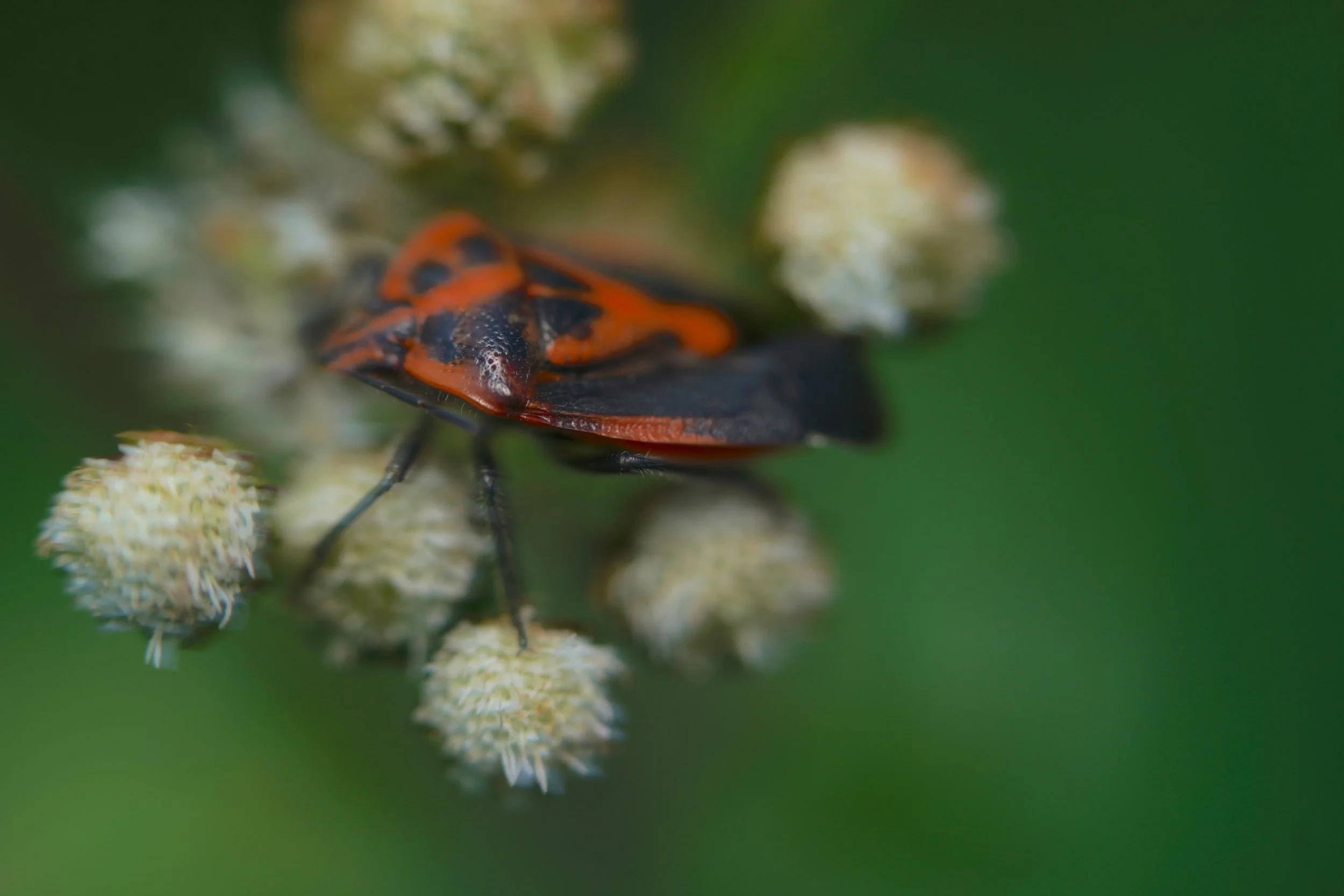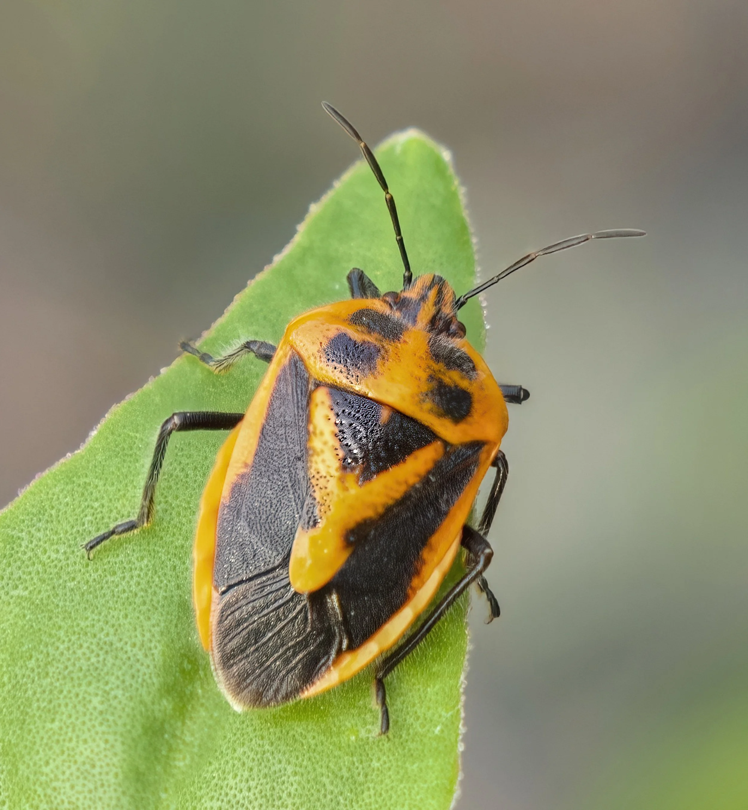 For comparison, here we have another focus stacked image of a horehound bug that we described in the previous section about photographing unobtrusively with a telephoto lens. (The natural colors on this one are a little different to the first). This time, different camera settings were used, based around the use of a long lens and a wider aperture. For this shot only three photos were focus stacked to create this image.