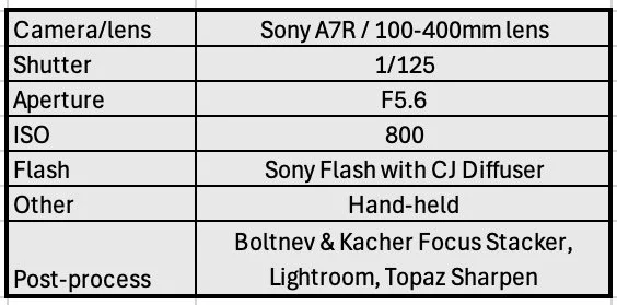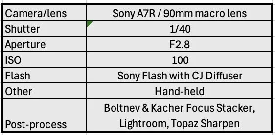 The camera here is fitted with a 90mm macro lens and 52mm of extension tubes to increase the magnification. Focusing was controlled from an iPad using the Camranger 2. A separate battery pack was used to extend operating time of the Camranger.
