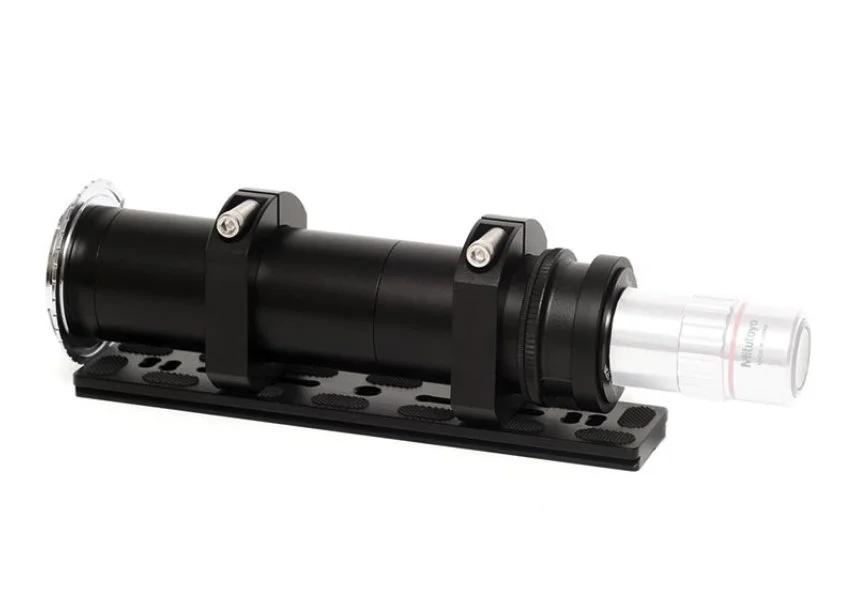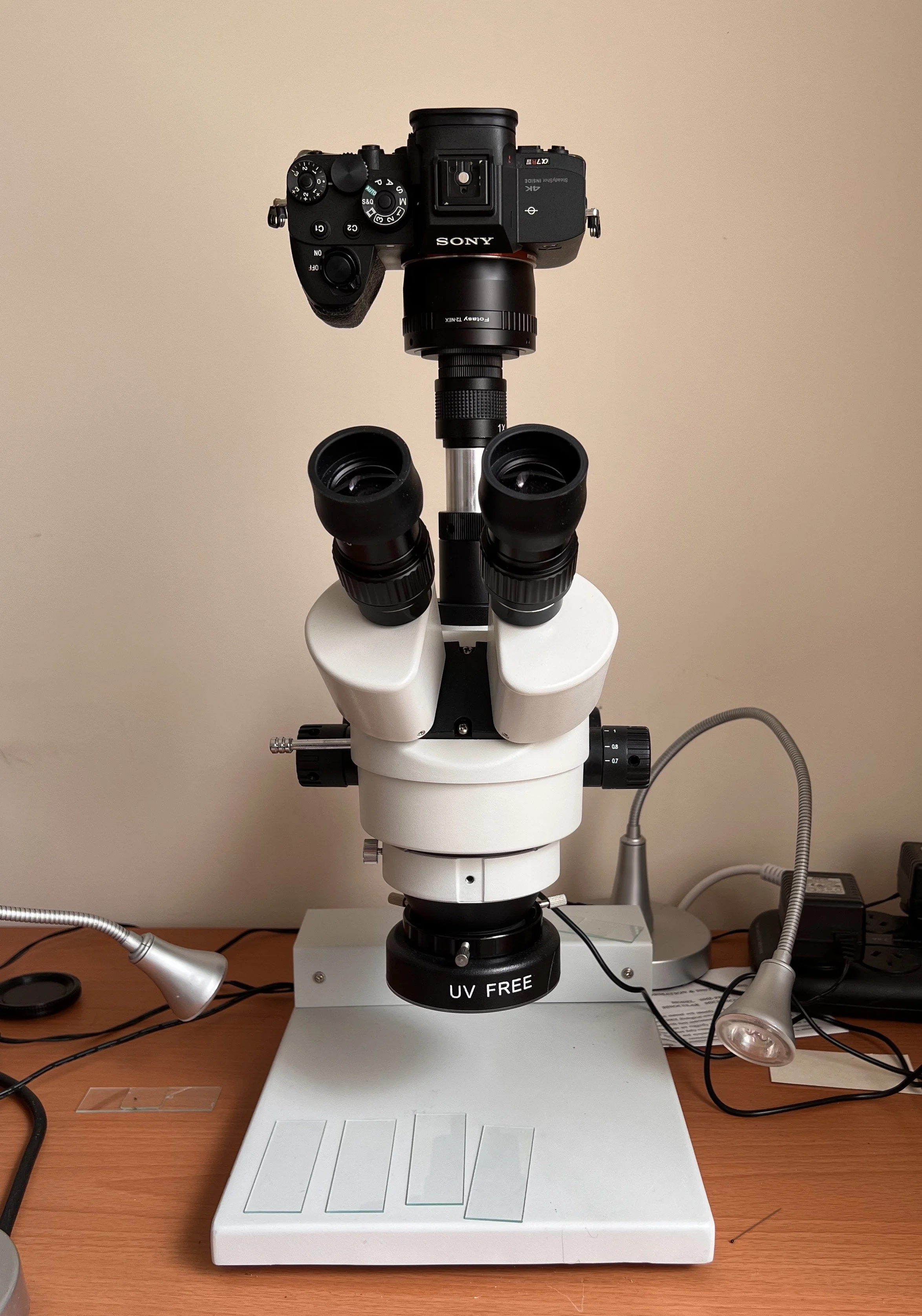 In the absence of a macro-rail and tube lens, it is possible to go for a more traditional approach of a camera fitted to the third ocular piece on a microscope. Generally, this is an inferior solution as it features less control over camera focusing and there are more obstacles to properly illuminating the subject. In terms of cost, a new microscope and adapter will be more expensive than the tube lens option.